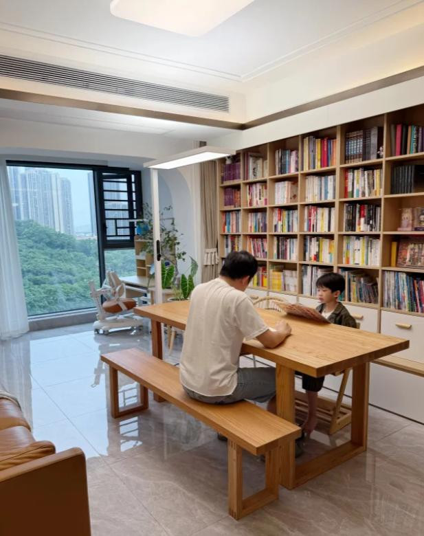 以前我们习惯了沙发+茶几+电视柜的组合,客厅就是“休息区”,大家都各自分散,孩子回自己房间做作业,大人忙自己的事,难得坐在一起。
